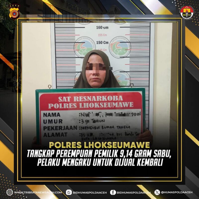 Lhokseumawe – Satuan Reserse Narkoba Polres Lhokseumawe berhasil mengamankan seorang perempuan yang diduga terlibat dalam tindak pidana penyalahgunaan narkotika jenis sabu pada Selasa (21/1/2025) sekitar pukul 17.30 WIB. Pelaku berinisial Nurlatifah (39), seorang ibu rumah tangga, ditangkap di rumahnya di Desa Hagu Teungoh, Kecamatan Banda Sakti, Kota Lhokseumawe.
