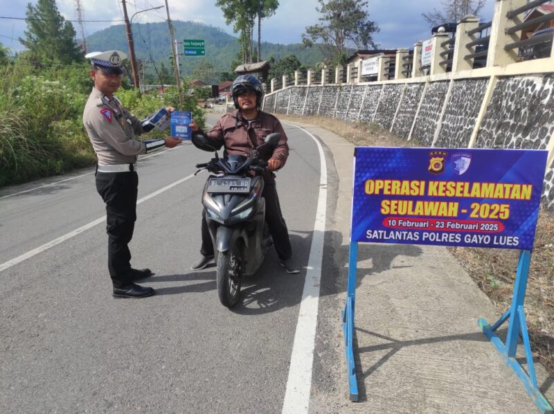 Blangkejeren – Dalam rangka meningkatkan kesadaran masyarakat akan pentingnya keselamatan dalam berlalu lintas, Satuan Lalu Lintas (Satlantas) Polres Gayo Lues melaksanakan kegiatan pembagian brosur dan himbauan tertib berlalu lintas kepada para pengguna jalan. Kegiatan ini merupakan bagian dari Operasi Keselamatan Seulawah 2025, yang bertujuan menciptakan keamanan, keselamatan, ketertiban, dan kelancaran lalu lintas (Kamseltibcar Lantas). Senin, 10 Februari 2025.
