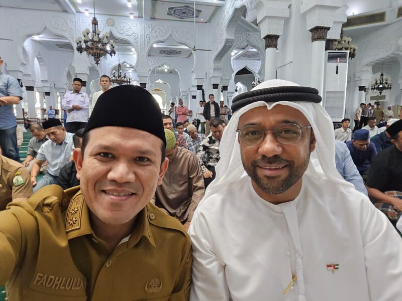 Banda Aceh – Wakil Gubernur Aceh Fadlullah bersama Duta Besar UEA His Excellency Abdulla Obaid Salem Al Dhaheri mengelar solat zuhur berjamaah di masjid Raya Baiturrahman Banda Aceh Pada, Selasa 11/3/2025.