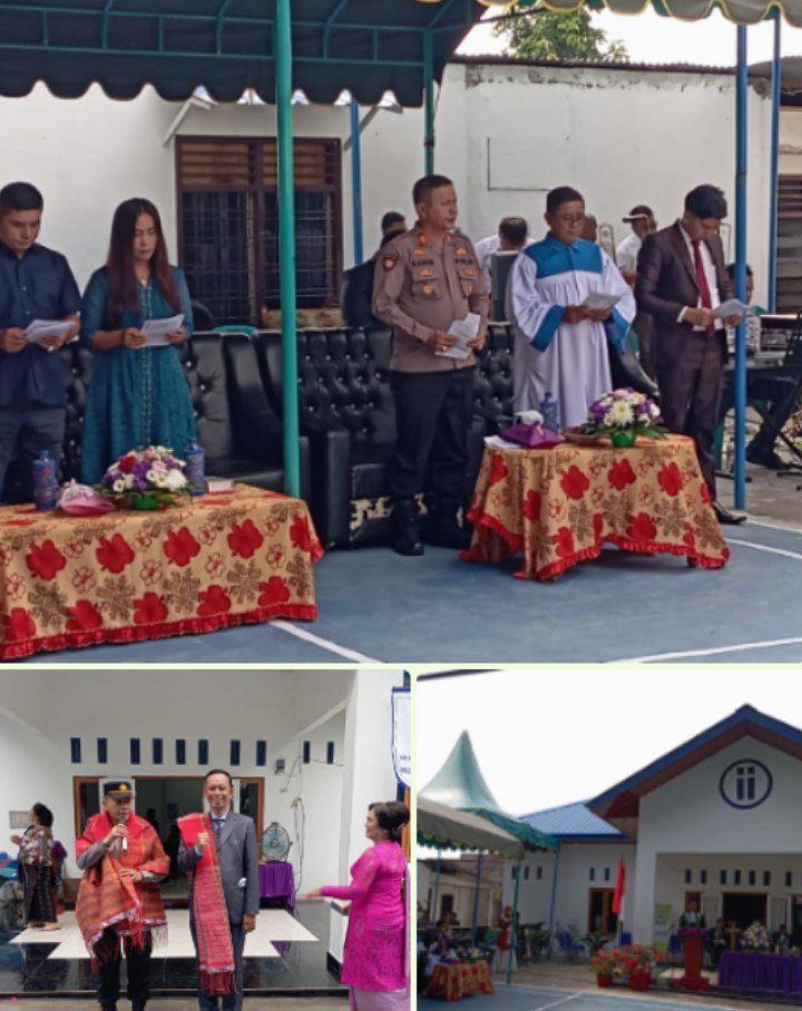 Kapolsek Padanghulu Polres Tebingtinggi AKP Marolop Samosir bersama Bhabinkamtibmas Polsek Padanghulu Aipda Pirman Manurung menghadiri peresmian rumah dinas Pendeta HKI Resort Khusus Marturia Tebingtinggi, berlokasi di Jalan Danau Toba Kota Tebingtinggi – Sumut, pada Minggu (16/3/2025).