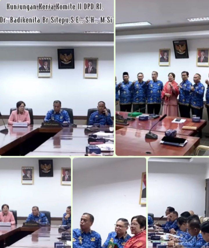 Kabanjahe – Bupati Karo, Brigjen Pol (Purn), Dr. dr. Antonius Ginting, SP.OG., M.Kes didampingi Wakil Bupati Karo, Komando Tarigan, SP dan Plh. Sekda Kab. Karo, Dr. Drs. Eddi Surianta, M.Pd terima Kunjungan Kerja Komite II DPD RI, Dr. Badikenita Br Sitepu, S.E., S.H., M.,Si di Ruang Rapat Bupati Karo, Senin (17/03/2025).