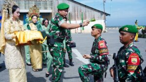 Pangdam juga mengingatkan para prajurit untuk membangun komunikasi yang baik dengan masyarakat setempat melalui kegiatan pembinaan teritorial. “Kedekatan dengan masyarakat adalah kunci keberhasilan tugas. Pastikan kehadiran kalian membawa rasa aman dan nyaman bagi mereka,” tambahnya.Usai upacara pemberangkatan, acara dilanjutkan dengan prosesi tepung tawar sebagai bentuk doa dan harapan keselamatan bagi para prajurit. Suasana khidmat terasa ketika Pangdam bersama Ketua Persit KCK Daerah I/BB, Ny. Galuh Rio Firdianto, membagikan tali asih kepada anak-anak yatim sebagai wujud kepedulian sosial kepada masyarakat sekitar.Acara ini juga dihadiri oleh Irdam I/BB, Pejabat Utama Kodam I/BB, Danlantamal I Belawan, Kabinda Sumut, unsur Forkopimda, pejabat TNI-Polri dan pemerintahan lainnya serta pengurus Persit KCK PD I/BB. Mereka turut memberikan dukungan semangat dan motivasi kepada Satgas Yonif 126/KC yang akan segera menjalankan tugas negara diperbatasan Papua.