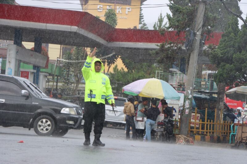 Berastagi – Di tengah guyuran hujan yang melanda kawasan Berastagi, Kapolres Tanah Karo AKBP Eko Yulianto, S.H., S.I.K., M.M., M.Tr. Opsla tetap turun langsung ke lapangan untuk mengatur arus lalu lintas di sekitar Simpang Tugu Juang, Minggu (06/04). Kegiatan ini dilakukan dalam rangka memastikan kelancaran arus balik pada masa Operasi Ketupat Toba 2025.