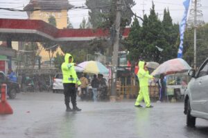 Dengan mengenakan jas hujan dan didampingi sejumlah pejabat utama Polres Tanah Karo, Kapolres Tanah Karo terlihat aktif memberikan arahan kepada pengendara dan petugas di lapangan agar arus kendaraan tetap tertib dan aman meski kondisi cuaca kurang mendukung.