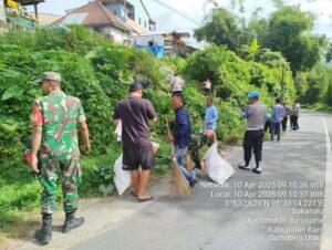 Barusjahe — Dalam semangat kebersamaan dan kepedulian terhadap lingkungan, Forkopimcam Kecamatan Barusjahe menggelar kegiatan gotong royong membersihkan tumpukan sampah yang berada di pinggir jalan umum Desa Sukanalu, Kecamatan Barusjahe, Kabupaten Karo, Kamis(10/4/2025).