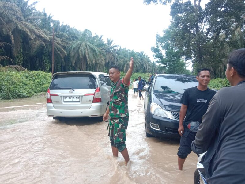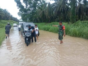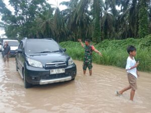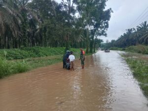 Personel Babinsa Koramil 09/NL Kodim 0209/Labuhanbatu, Sertu Suhendri, melaksanakan kegiatan pemantauan langsung terhadap kondisi banjir yang terjadi di ruas Jalan Lintas Aek Nabara – Negeri Lama, tepatnya di Desa Perkebunan Pangkatan, Kecamatan Pangkatan, Kabupaten Labuhanbatu. Minggu (20/4/2025).