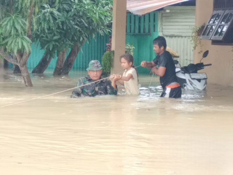 Babinsa bersama aparat terkait melakukan evakuasi terhadap warga yang terdampak banjir akibat curah hujan tinggi dalam beberapa hari terakhir.