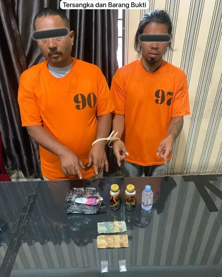 Dalam penggeledahan yang dilakukan di tempat kejadian perkara (TKP), petugas menemukan barang bukti berupa 2 paket plastik klip berisi kristal putih diduga sabu dengan berat bersih 1,27 gram, 1 kotak kertas warna pink dibalut lakban hitam, 3 botol minuman mineral danuang tunai sebesar Rp7.000.