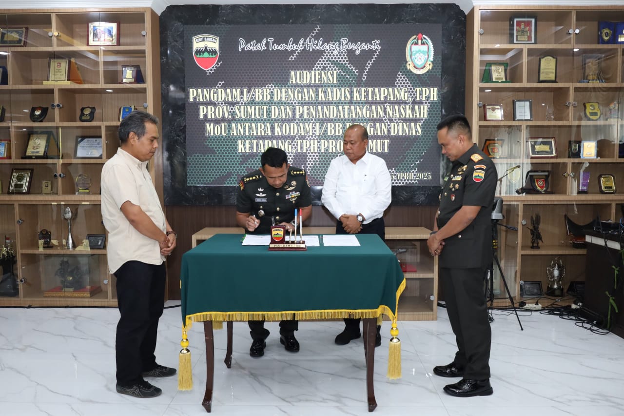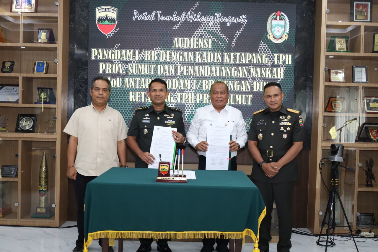 Komando Daerah Militer I/Bukit Barisan (Kodam I/BB) bersama Dinas Ketahanan Pangan, Tanaman Pangan dan Hortikultura Provinsi Sumatera Utara sepakat menjalin kerja sama strategis untuk memperkuat ketahanan pangan daerah. Kesepakatan ini terjalin dalam audiensi yang berlangsung di Makodam I/BB, Jumat (25/4/2025), dan ditandai dengan penandatanganan nota kesepahaman.