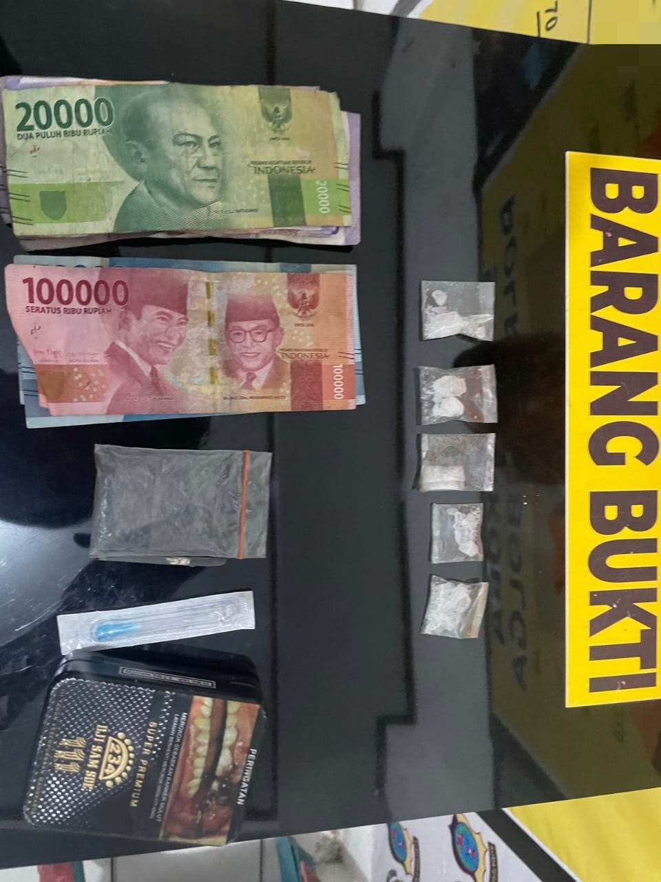 Setelah dilakukan penggeledahan, Polisi mengamankan barang bukti berupa : 1 (satu) Kotak Kaleng Rokok Dji Sam Soe yang didalamnya terdapat 4 (empat) Buah Plastik bening berukuran sedang yang berisi Sabu, 1 (satu) buah plastik bening berukuran sedang yang berisikan 2 (dua) paket kecil berisi Sabu yang keseluruhannya ditimbang dengan berat Bruto 4,6 (empat koma enam) gram, 1 (satu) buah plastik sedang, 1 (satu) buah Jarum Suntik, 1 (satu) Buah Sendok sekop yang terbuat dari sedotan plastik dan uang tunai sebesar Rp. 337.000,- (Tiga Ratus Tiga Puluh Tujuh Ribu Rupiah), yang diakui Tersangka adalah miliknya.