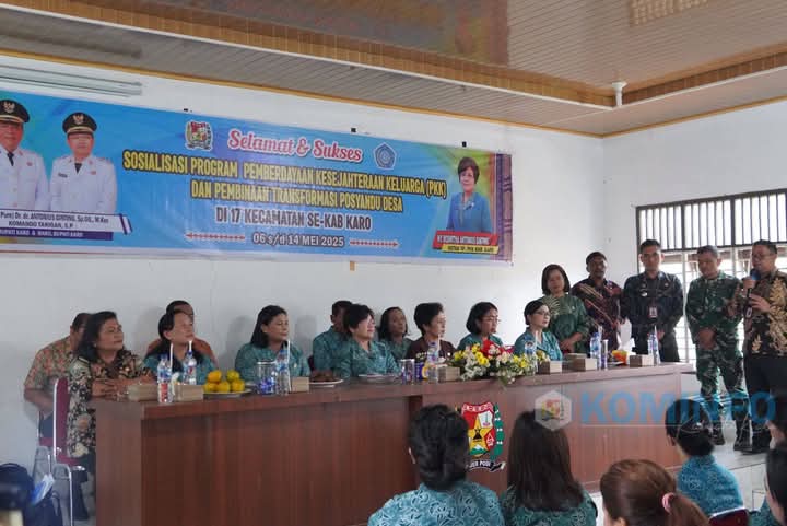 Tigapanah – Ketua Tim Penggerak PKK Kabupaten Karo, Ibu Roswitha Antonius Ginting, hadir dalam kegiatan Sosialisasi Program Pemberdayaan Kesejahteraan Keluarga (PKK) dan Pembinaan Transformasi Posyandu Desa yang dilaksanakan di Aula Kantor Camat Tigapanah, Kamis (8/5/2025).