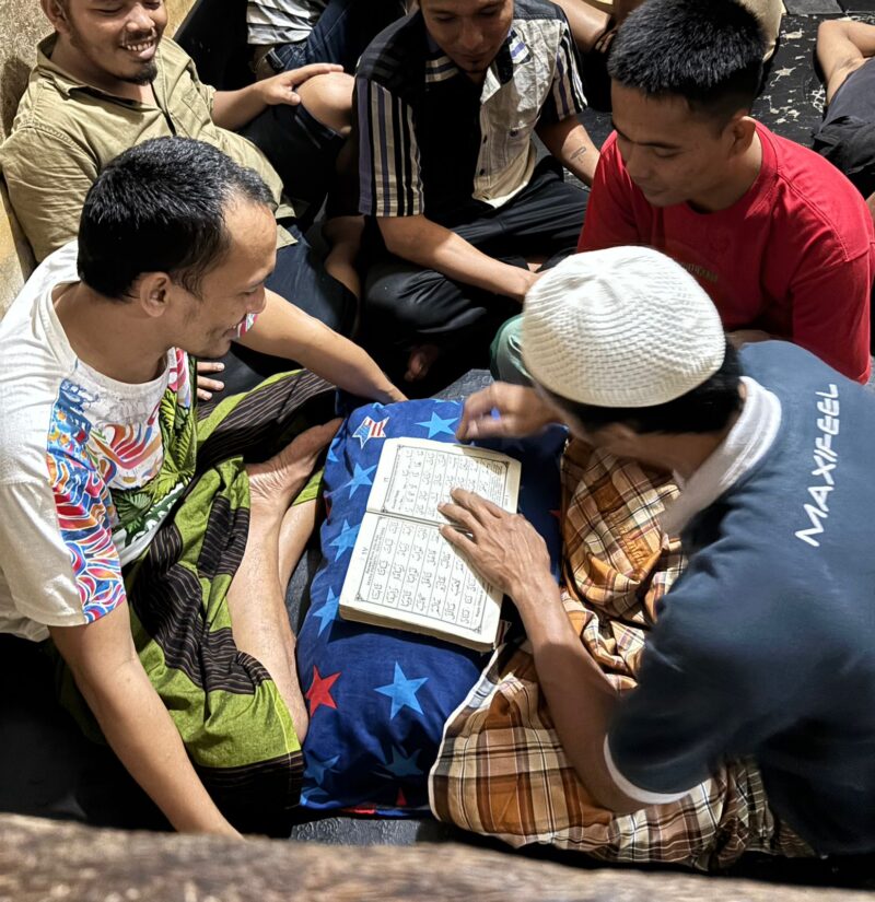 Batu Bara | Warga binaan Lapas Labuhan Ruku mengikuti kegiatan belajar mengaji dan membaca Al-Qur’an setelah sholat Maghrib pada Senin, 12 Mei 2025.
