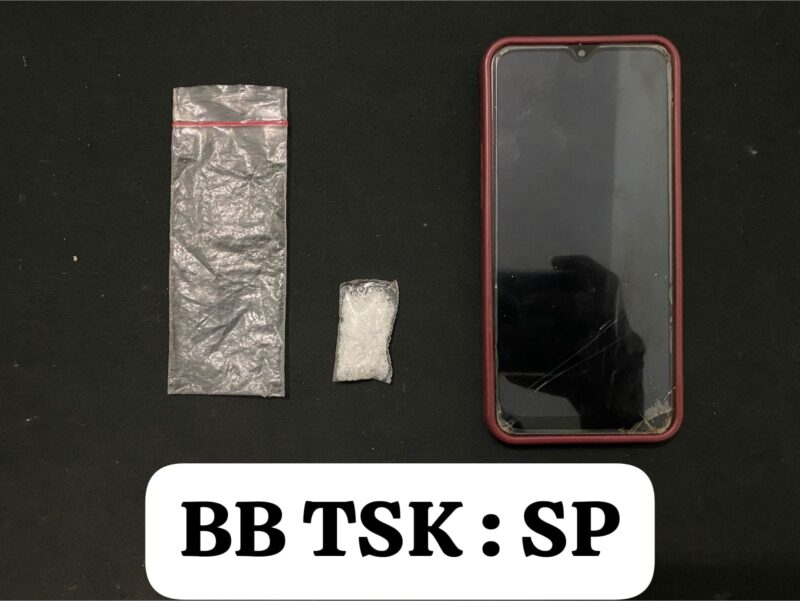 Dari tangan tersangka, petugas berhasil mengamankan sejumlah barang bukti, antara lain: satu plastik bening transparan berukuran sedang berisi narkotika jenis sabu, satu plastik klip berukuran besar kosong, dan satu unit handphone Android merk Oppo berwarna merah.