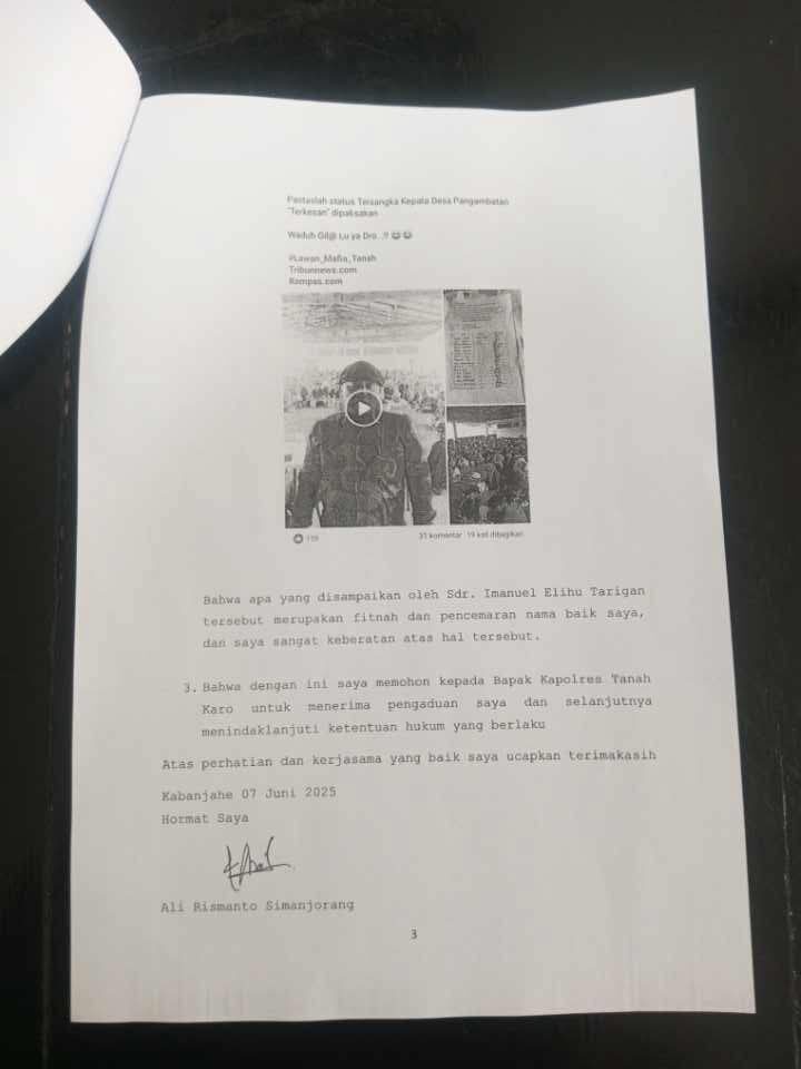 Laporan pengaduan tersebut disampaikan Ketua BPD Pengambatan Ali Resmanto Simanjorang kepada Kapolres Tanah Karo, pasca beredarnya status yang di unggah akun media social Facebook atas nama @Imanuel Elihu Tarigan yang dianggap telah sengaja menebar fitnah dan ada unsur intimidasi terhadap dirinya dalam proses Penegakkan hukum yang saat ini masih berjalan di Polres Tanah Karo.