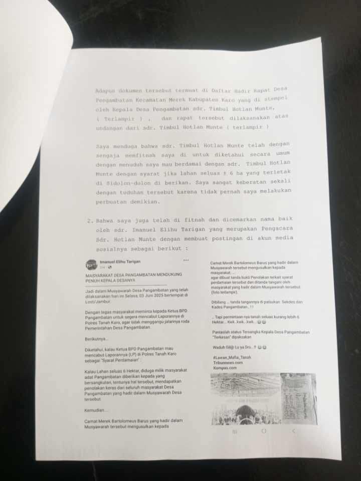 Dituding membuat syarat perdamaian dengan isu palsu, soal lahan adat 6 hektar, Ketua BPD Desa Pengambatan, Kecamatan Merek, Kabupaten Karo kembali membuat laporan Pengaduan Masyarakat (Dumas) ke Mapolres Tanah Karo. Pada 07 Juni 2025 kemarin.