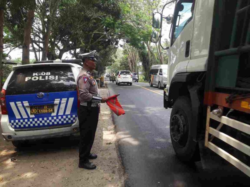 Petugas bertugas mengatur arus lalu lintas agar tetap lancar dan mencegah terjadinya kemacetan serta kecelakaan.