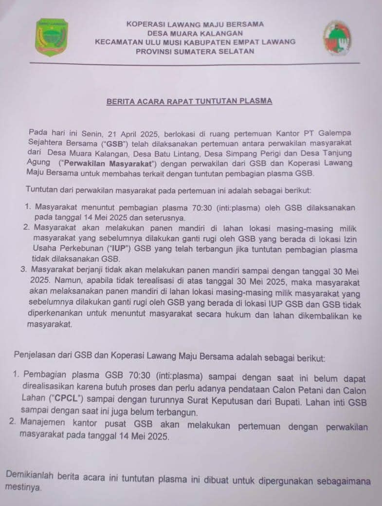 Sebagaimana pada pemberitaan sebelumnya, pada bulan April lalu 3 hari sebelum PSU Bupati Empat Lawang, masyarakat Desa Muara Kalangan dan Desa Batu Lintang mengadakan Aksi unjuk rasa di PT GSB ( Galempa Sejahtera Bersama ) dengan melakukan ” Panen Mandiri ” di area PT GSB tepatnya pada tanggal 21 April 2025.