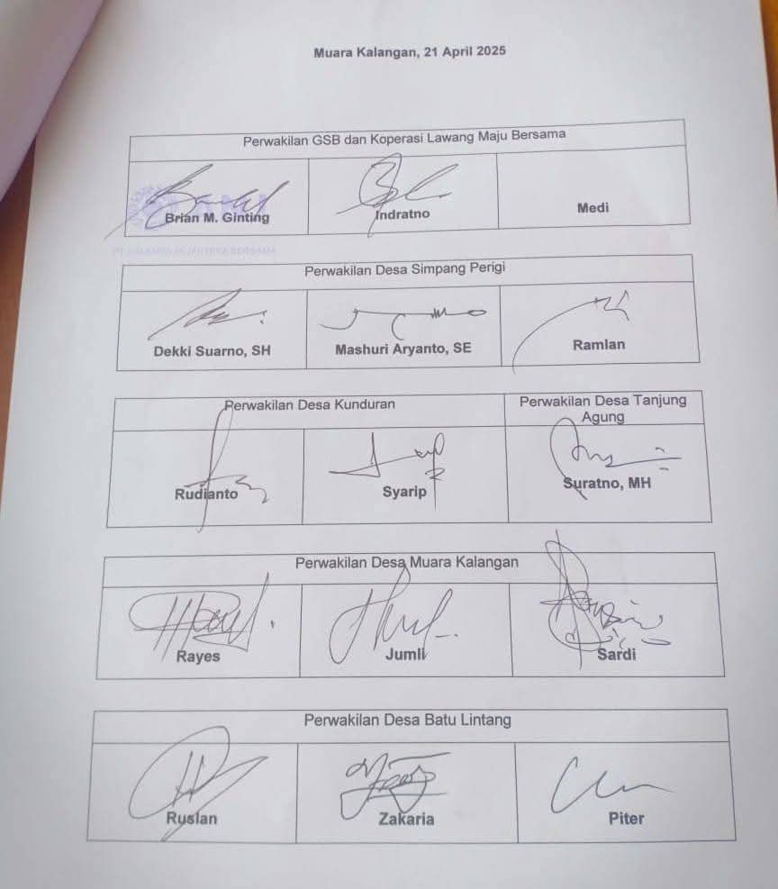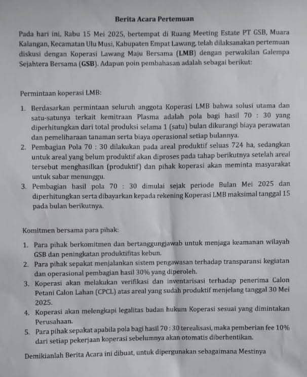 Dampak dari kericuhan itu, maka pada tanggal 14 Mei 2025 PT GSB berjanji untuk mempertemukan perwakilan dari 5 desa dengan Top Management. Tapi yang terjadi adalah Pertemuan antara Koperasi LMB dan PT GSB dengan keputusan yang tidak jelas.