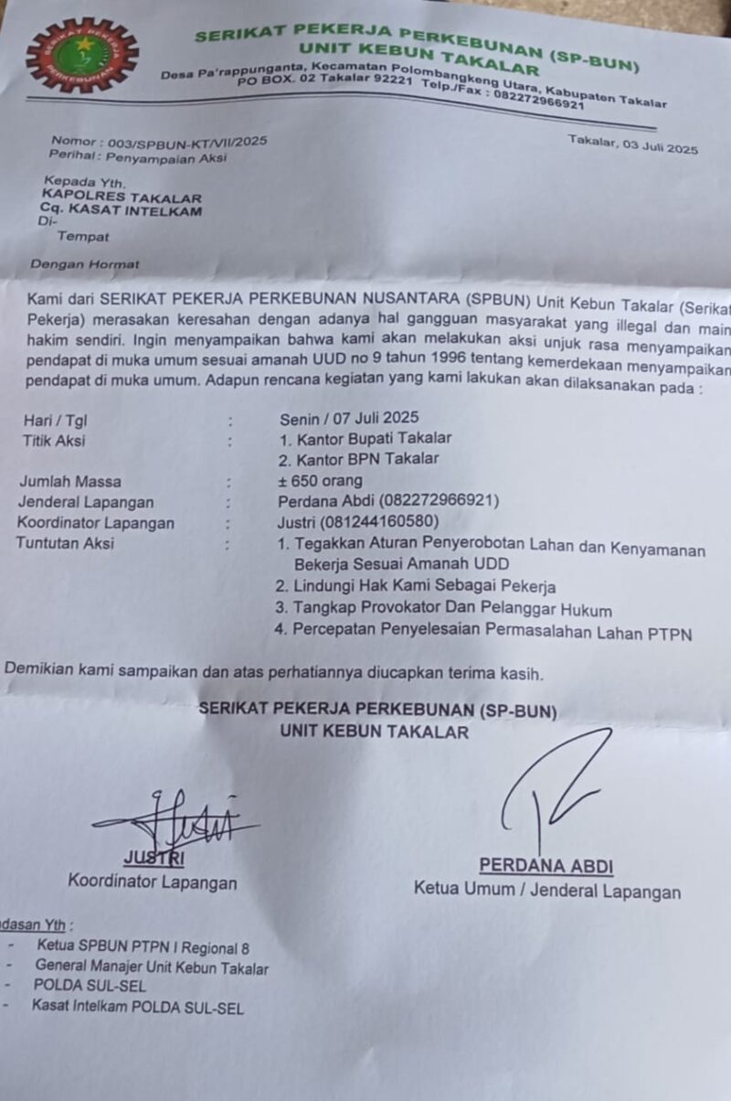 TAKALAR – tribun1.com | Sekitar 650 massa dari Serikat Pekerja Perkebunan Unit (SPBUN) PTPN I Kebun Takalar akan menggelar aksi unjuk rasa damai pada Senin, 7 Juli 2025, di Kantor Bupati Takalar dan Kantor Badan Pertanahan Nasional (BPN) Takalar. Aksi ini dilakukan sebagai bentuk protes atas gangguan yang dialami para pekerja saat hendak melakukan panen tebu, yang diduga dihalangi oleh oknum masyarakat setempat.