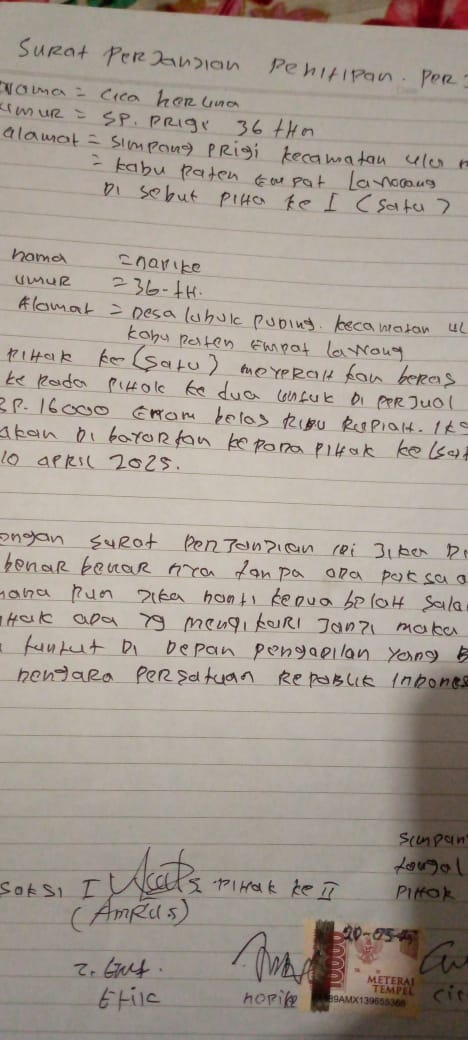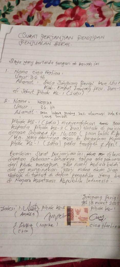 Sementara itu salah satu dari mereka yakni Nopi ketika di temui oleh korban di rumah orang tuanya mengatakan “Beras sudah habis terjual dan uangnya sudah habis terpakai buat saya wira-wiri dan jika ingin memenjarakan saya silahkan lapor polisi saja. Ucap Nopi