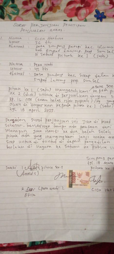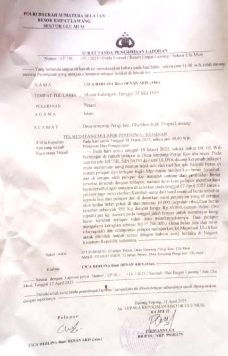 Ulu Musi – Sudah tiga bulan lapor ke Polsek Ulu Musi oleh korban penipuan terhadap pedagang beras yakni Cica Herlina ( 36 ) warga desa Simpang Perigi, Kecamatan Ulu Musi, Kabupaten Empat Lawang, Provinsi Sumatera Selatan. Rabu (9/7/2025)