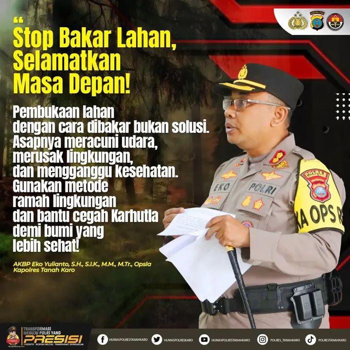 Dalam menghadapi ancaman kebakaran hutan dan lahan (karhutla) yang kerap terjadi di musim kemarau, Kapolres Tanah Karo AKBP Eko Yulianto, S.H., S.I.K., M.M., M.Tr.Opsla, mengimbau seluruh elemen masyarakat untuk menghentikan praktik pembakaran hutan dan lahan, baik untuk membuka kebun maupun keperluan lainnya.