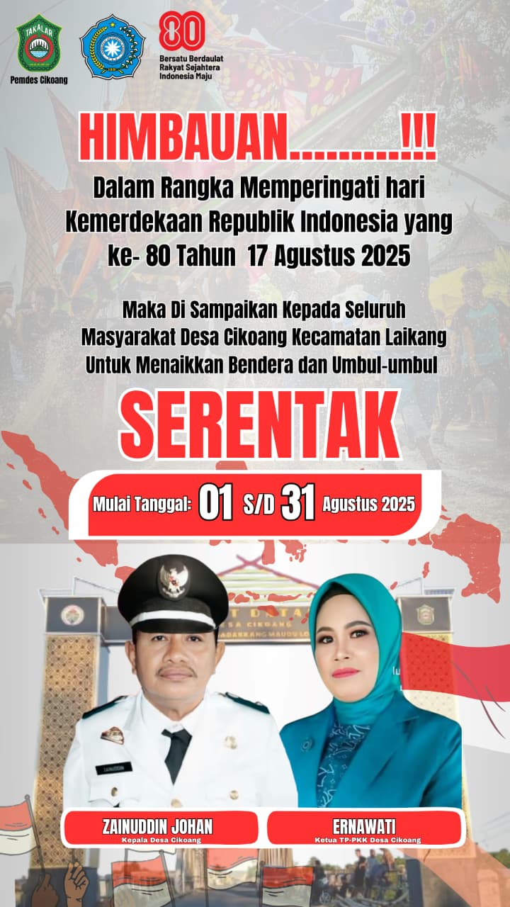 Pemdes Cikoang mengajak seluruh lapisan masyarakat untuk berpartisipasi aktif dalam memeriahkan HUT RI ke-80 dan bersama-sama menjaga semangat persatuan dan kesatuan bangsa. Mari kita rayakan kemerdekaan ini dengan penuh suka cita dan rasa syukur.