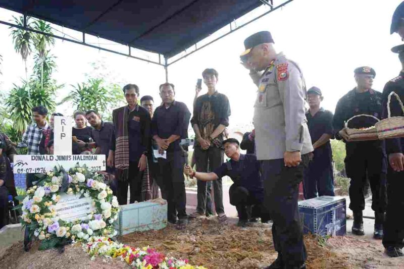 PEKANBARU | Suasana haru menyelimuti pemakaman Iptu (Anumerta) Donald Junus Halomoan, anggota Brimob Polda Riau yang gugur saat menjalankan tugas memadamkan kebakaran hutan dan lahan (karhutla) di wilayah Rokan Hilir, Provinsi Riau. Ia dimakamkan pada Kamis sore, 7 Agustus 2025, di Tempat Pemakaman Umum Umban Sari, Rumbai, Kota Pekanbaru. Prosesi pemakaman dilangsungkan secara kedinasan, sebagai bentuk penghormatan terakhir negara atas pengabdian Donald sebagai Bhayangkara sejati yang wafat dalam tugas.