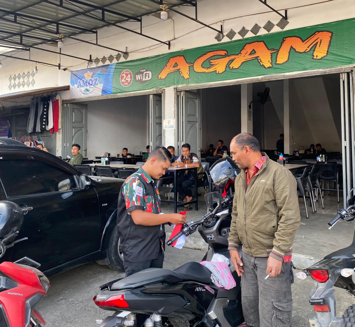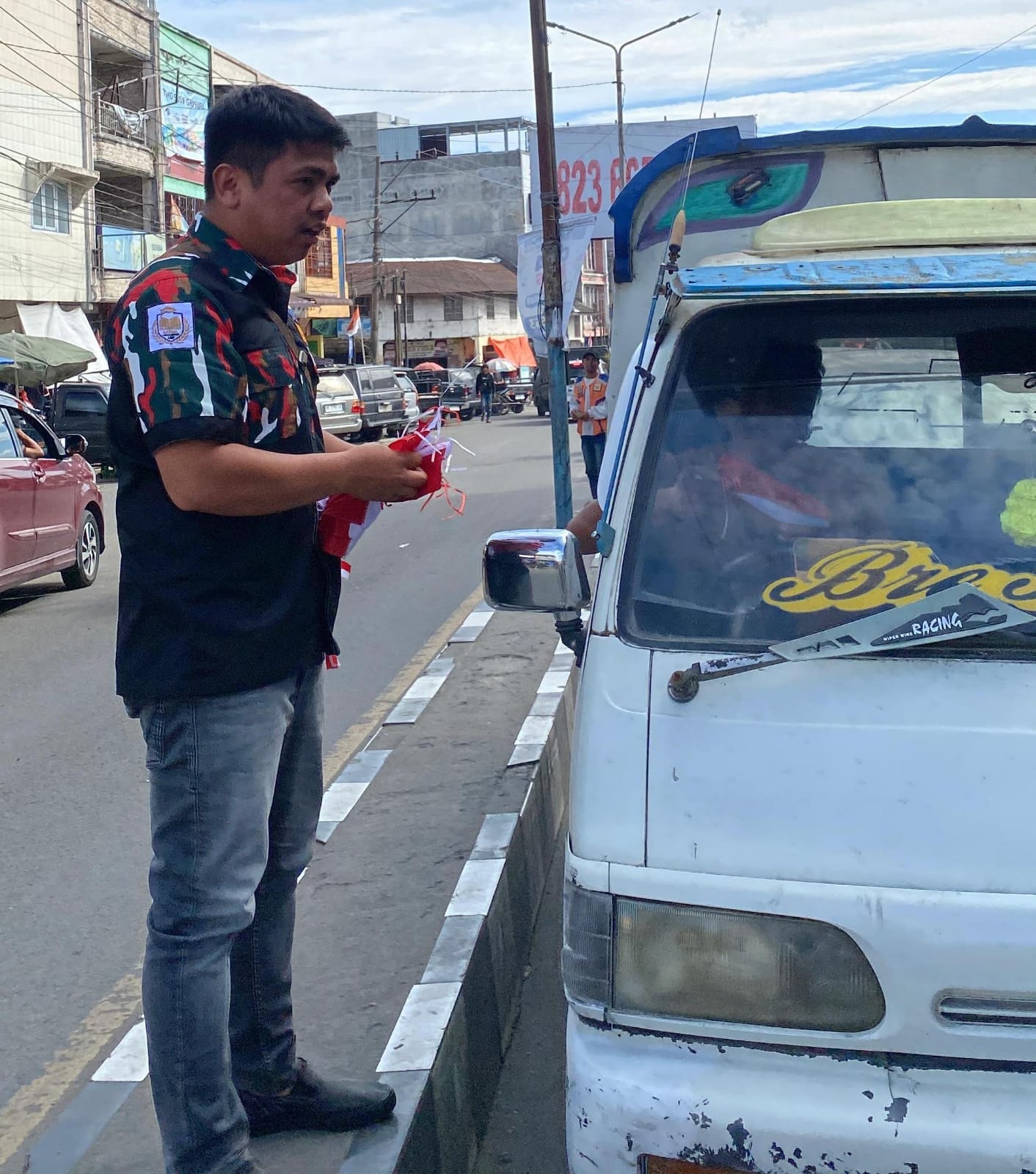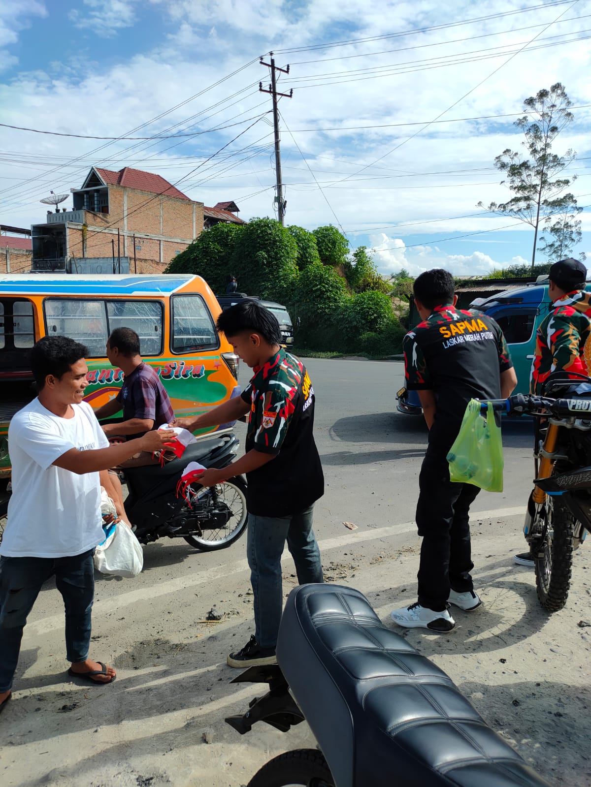 SAPMA LMP TAN KAR membagikan bendera merah putih ke setiap kendaraan,mulai dari mobil dan sepeda motor yang melintas di lokasi tugu Nini depan Kedai Agam dan Simpang Laudah Kabanjahe.
