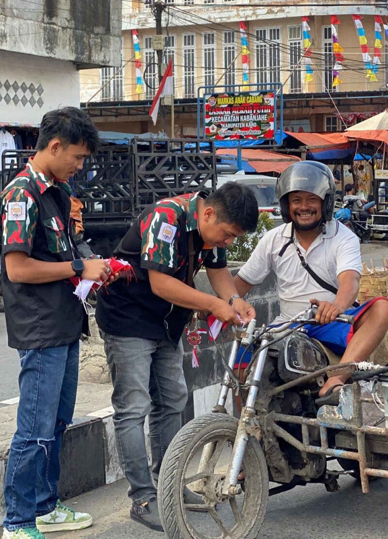 Dalam rangka Menyambut Hari Ulang Tahun (HUT) Republik Indonesia (RI) ke 80, atau menyambut proklamator kemerdekaan Markas Cabang (Macab) Laskar Merah Putih (LMP) Kabupaten Karo melalui Satuan Pelajar dan Mahasiswa Laskar Merah Putih Tanah Karo (SAPMA LMP TAN KAR ) membagi bagikan bendera merah putih,Jumat (15/08/2025) mulai pukul 15.00 Wib sampai dengan selesai di dua titik Kabanjahe Kabupaten Karo Sumatera Utara.