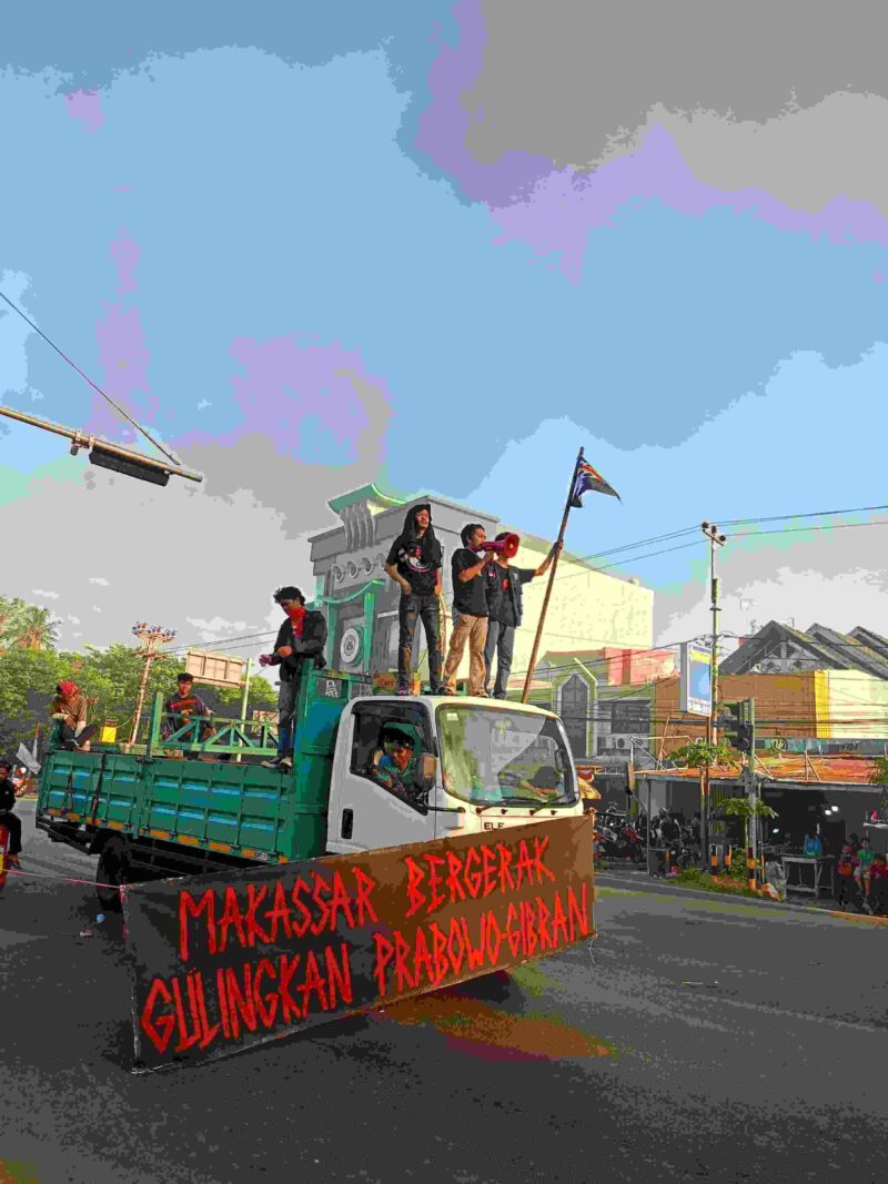 Massa aksi membawa spanduk tuntutan bertuliskan “Makassar Bergerak Gulingkan Prabowo-Gibran” sambil bergantian melakukan orasi politik.