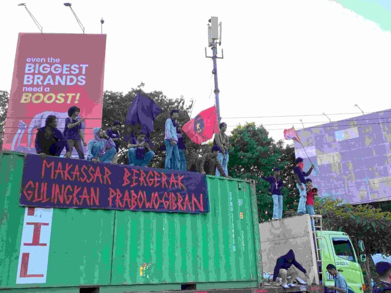 Massa aksi membawa spanduk tuntutan bertuliskan “Makassar Bergerak Gulingkan Prabowo-Gibran” sambil bergantian melakukan orasi politik.