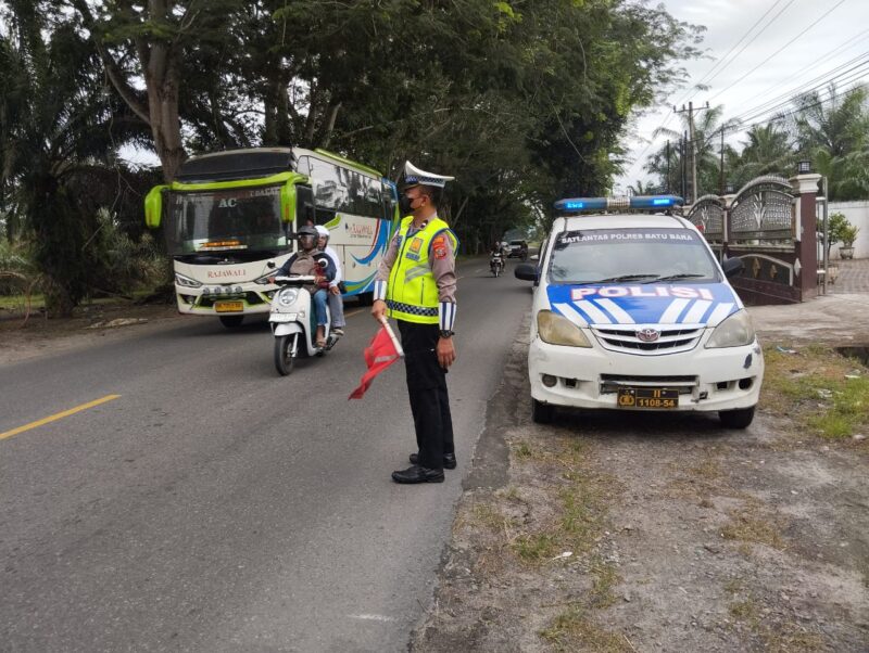 Batu Bara – Satuan Lalu Lintas (Sat Lantas) Polres Batu Bara meningkatkan kehadiran di jalan dengan melaksanakan kegiatan pengaturan lalu lintas dan patroli kibas bendera di sejumlah titik rawan kecelakaan dan kemacetan.