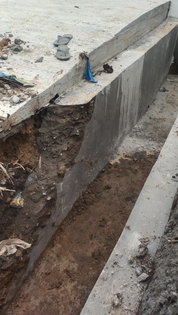 Pantauan awak media di lokasi menunjukkan para pekerja sedang membersihkan runtuhan material sekitar lima meter dari parit jembatan. Di lokasi runtuhan tampak jelas parit yang dibangun tanpa pondasi, sehingga sangat rawan ambruk terlebih ketika tergerus air.