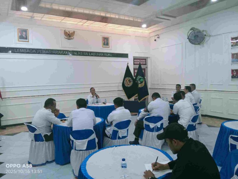 Labuhan Ruku– Kepala Lembaga Pemasyarakatan (Kalapas) Kelas IIA Labuhan Ruku, Soetopo Berutu, memimpin rapat internal dengan jajaran pejabat struktural di Aula Lapas setelah mengikuti zoom meeting dengan Menteri Imigrasi dan Pemasyarakatan, Jenderal Purn. Drs. Agus Adrianto, S.H., M.H. Rapat ini bertujuan menindaklanjuti arahan menteri terkait pengamanan, pemberantasan narkoba, dan penipuan di dalam Lapas.