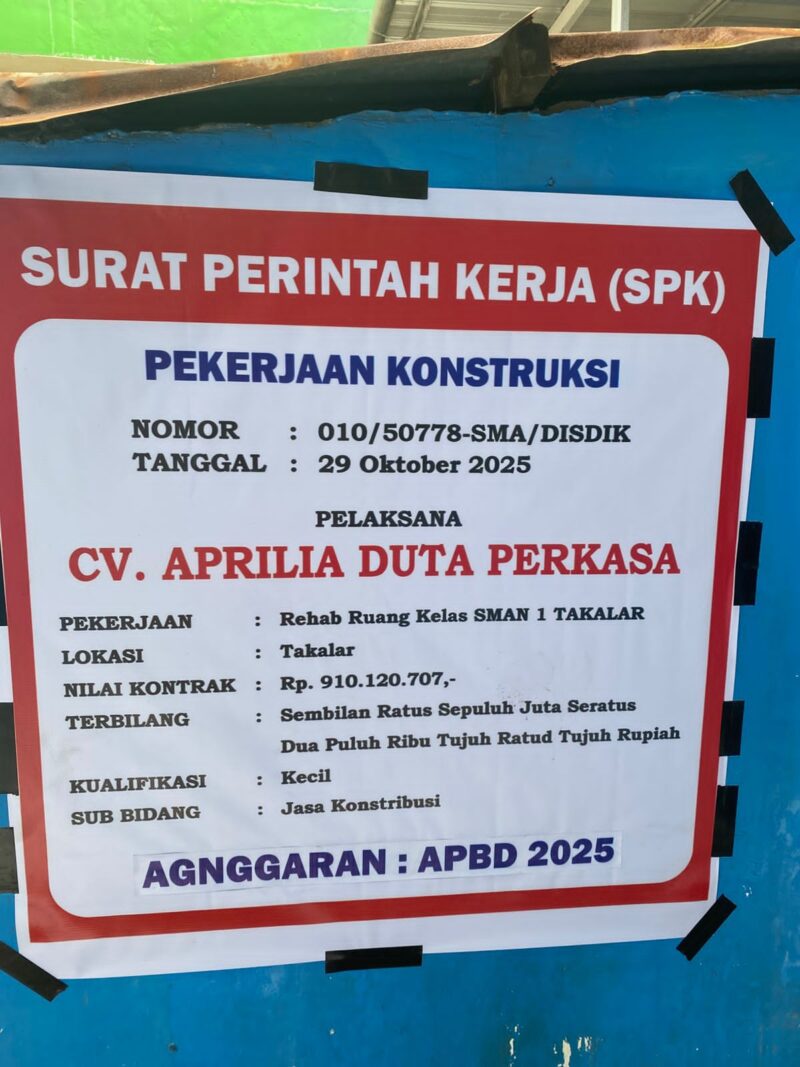 Takalar – Tribun1.com | pembangunan rehabilitasi ruang kelas sekolah dengan sumber dana yang di peroleh dari APBD tahun anggaran 2025 sebesar rp. 910 120 707,-program yang sudah di canang oleh pemerintahan Bapak Presiden H. Prabowo Subianto untuk menunjang kesejahteraan para murid dan guru untuk belajar dan mengajar di seluruh pelosok negri Negara kesatuan republik indonesia dan itu langsung di perintahkan oleh bapak presiden H.Prabowo Subianto melalui pembantunya di kementrian pendidikan.