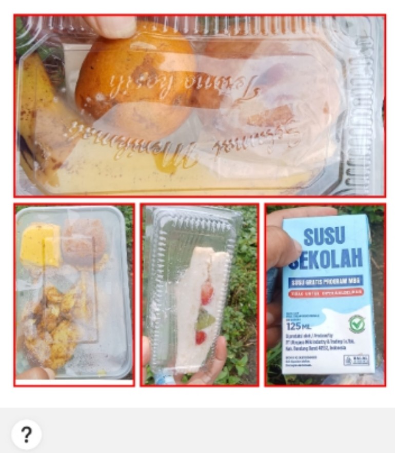 Selama tiga hari berturut-turut, siswa menerima menu berupa tahu, tempe, tahu Sumedang, dua potong ayam, serta roti tawar dengan olesan krim di satu sisi. Sejumlah orang tua murid menilai menu tersebut tidak memenuhi prinsip gizi seimbang bagi anak usia sekolah dasar.