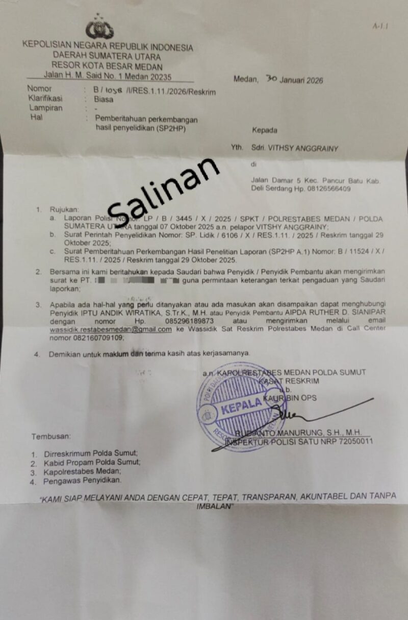 Perkembangan perkara hingga kini masih berada pada tahap penyelidikan. Hal itu berdasarkan Surat Pemberitahuan Perkembangan Hasil Penyelidikan (SP2HP) tertanggal 30 Januari 2026 yang diterima pihak perusahaan.