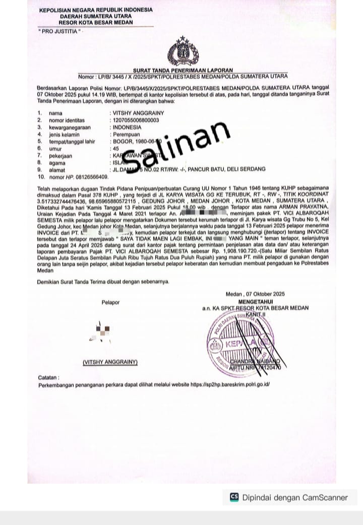 Tribun1.com – MEDAN – Dugaan penyalahgunaan identitas badan usaha kembali mencuat di Sumatera Utara. PT Vici Albaroqah Semesta (PT VAS) melaporkan adanya indikasi penggunaan nama dan legalitas perusahaan oleh pihak lain, yang berdampak pada munculnya transaksi dan kewajiban pajak yang tidak diakui oleh perusahaan.